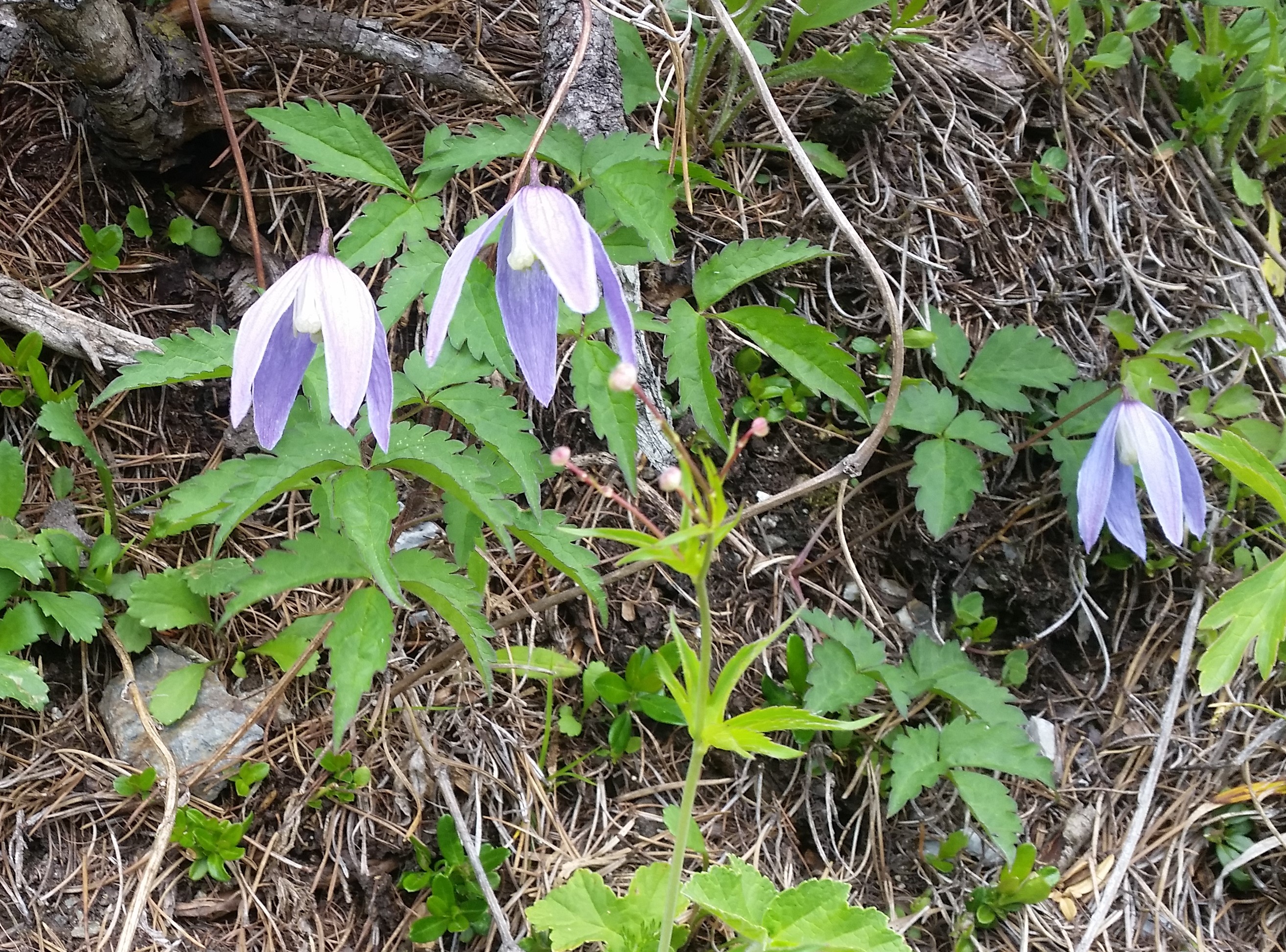 One third up we pass the first and second hairpins and it also seems easy but then no more for several kilometres.  The road meanders up through the forest where the broad leaf trees gradually give way to the pines. On a steep shady slope clinging to the rocks and a few branches is the Alpine Clematis.  It’s four large paper like purple petals hang tired like my legs.  I am struck how similar the leaves looks to the Clematis in my garden.