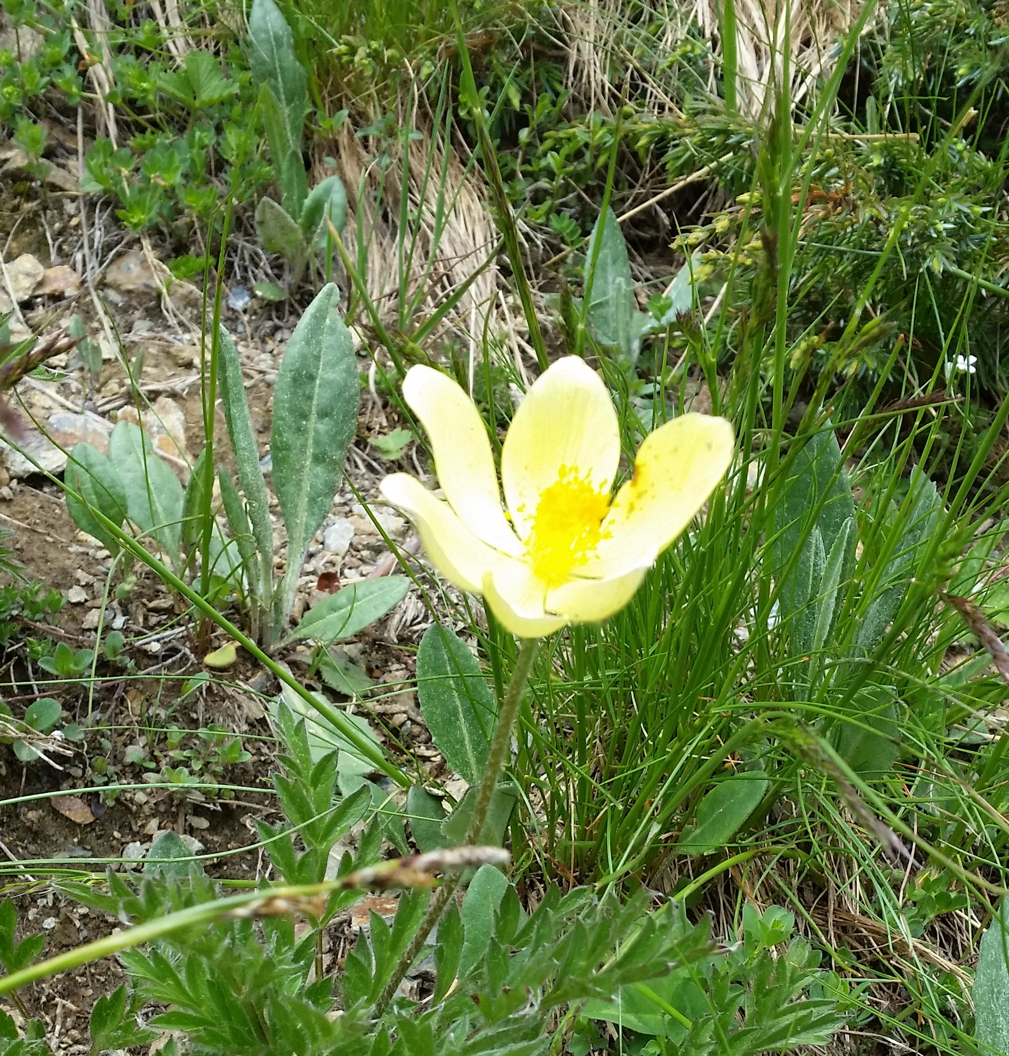 Andy Cherkas, my companion in pain, and I stop on one of the bends.  The steep slope, green from hardy mountain succulents is dotted with yellow pasque flowers with their fern like leaves.