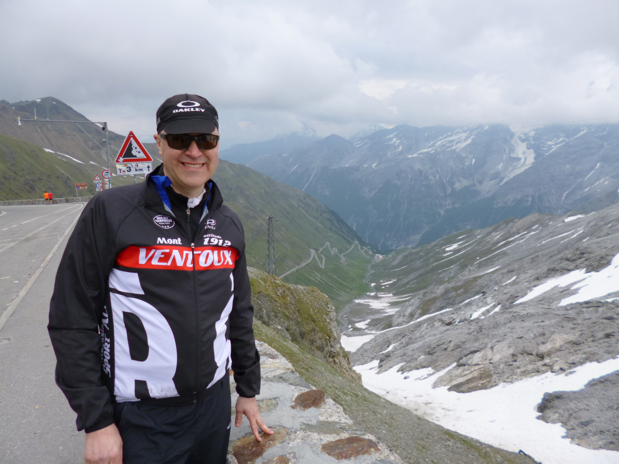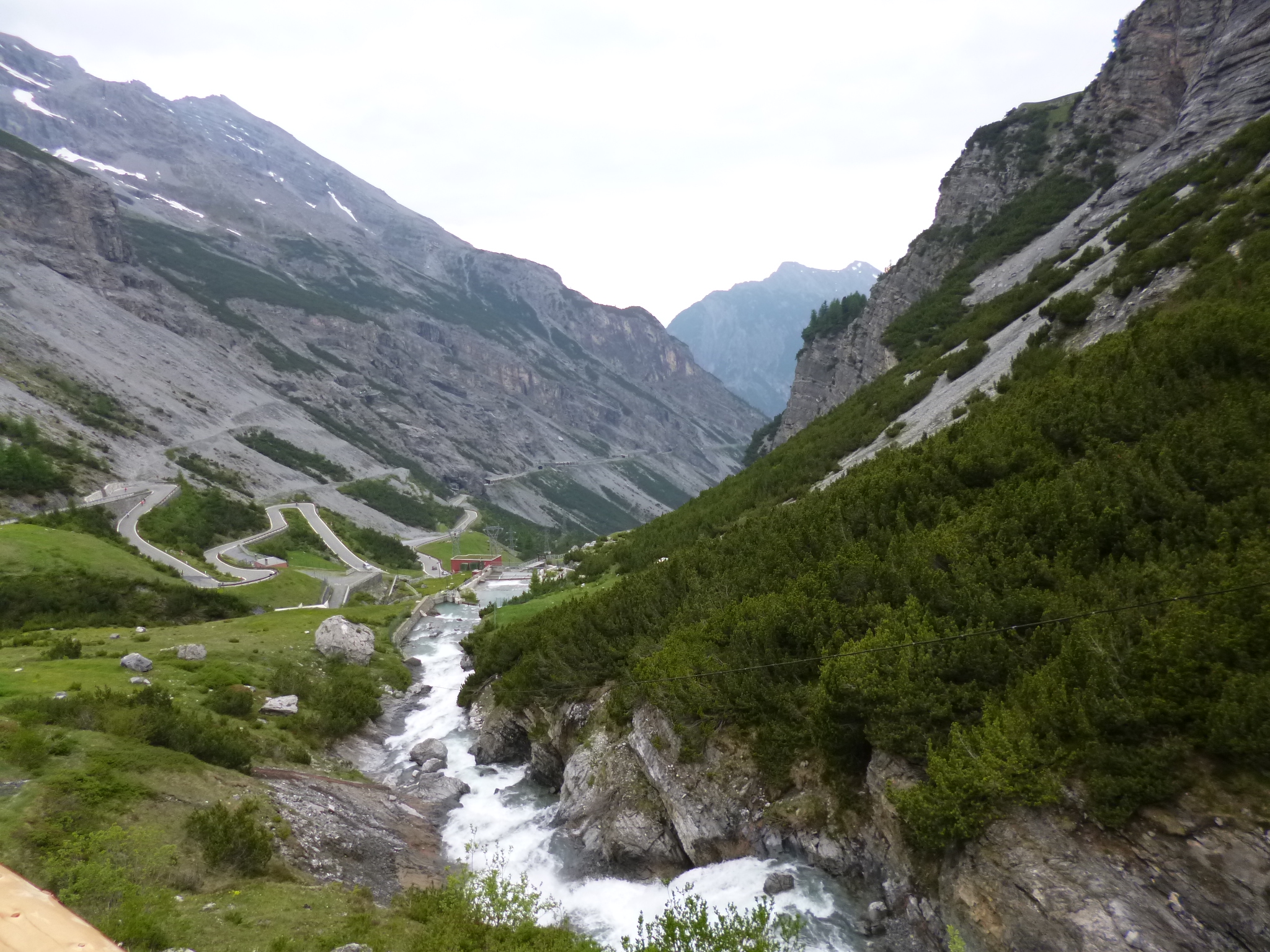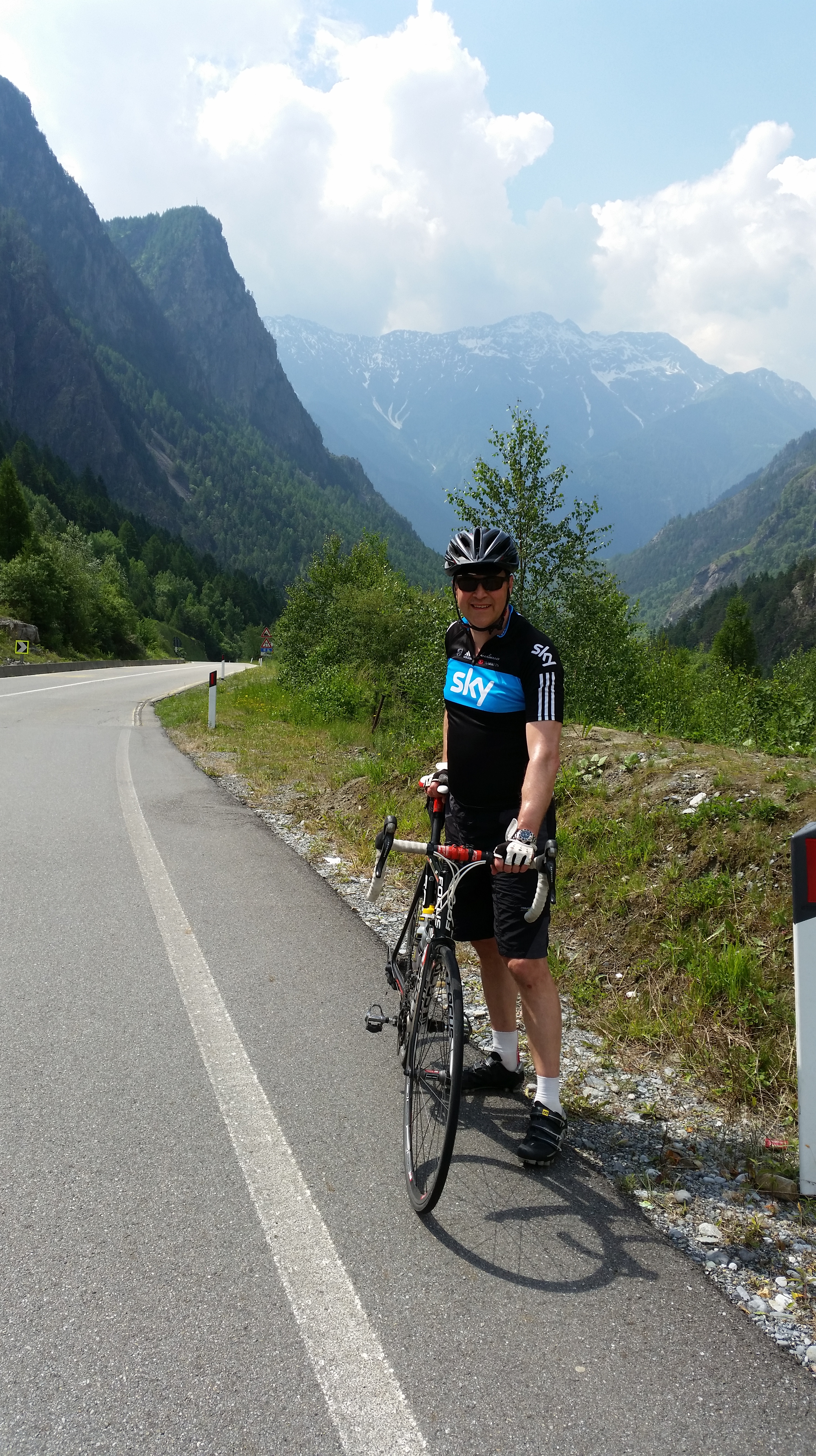 The numbered bends continue.  I find it easier to count the prime numbers as there are only 15 and as each turn up the mountain the trees thin out until by turn 22 we reach the wide open space.  Green hillside gives way in places to rocky scree and high up the snow covered pass looks imposing at the top of a grey green wall.  The road like a folded ribbon snaking up the hillside beckons the tired cyclist. In the Giro they are probably powering up at close to 15 miles an hour, we continue our more modest pace.