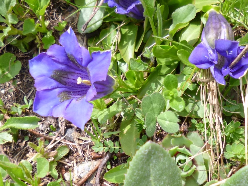 A little further up I leapt off my bike and rushed to take a photograph of some clumps of Trumpet Gentians (Gentiana kochiana).  This is the first time that I have seen these beautiful trumpet flowers that only grow high up in the mountains. The name gentian is after the Illurian King Gentius (about 200 BCE) who recognised the medicinal properties of the yellow gentian.