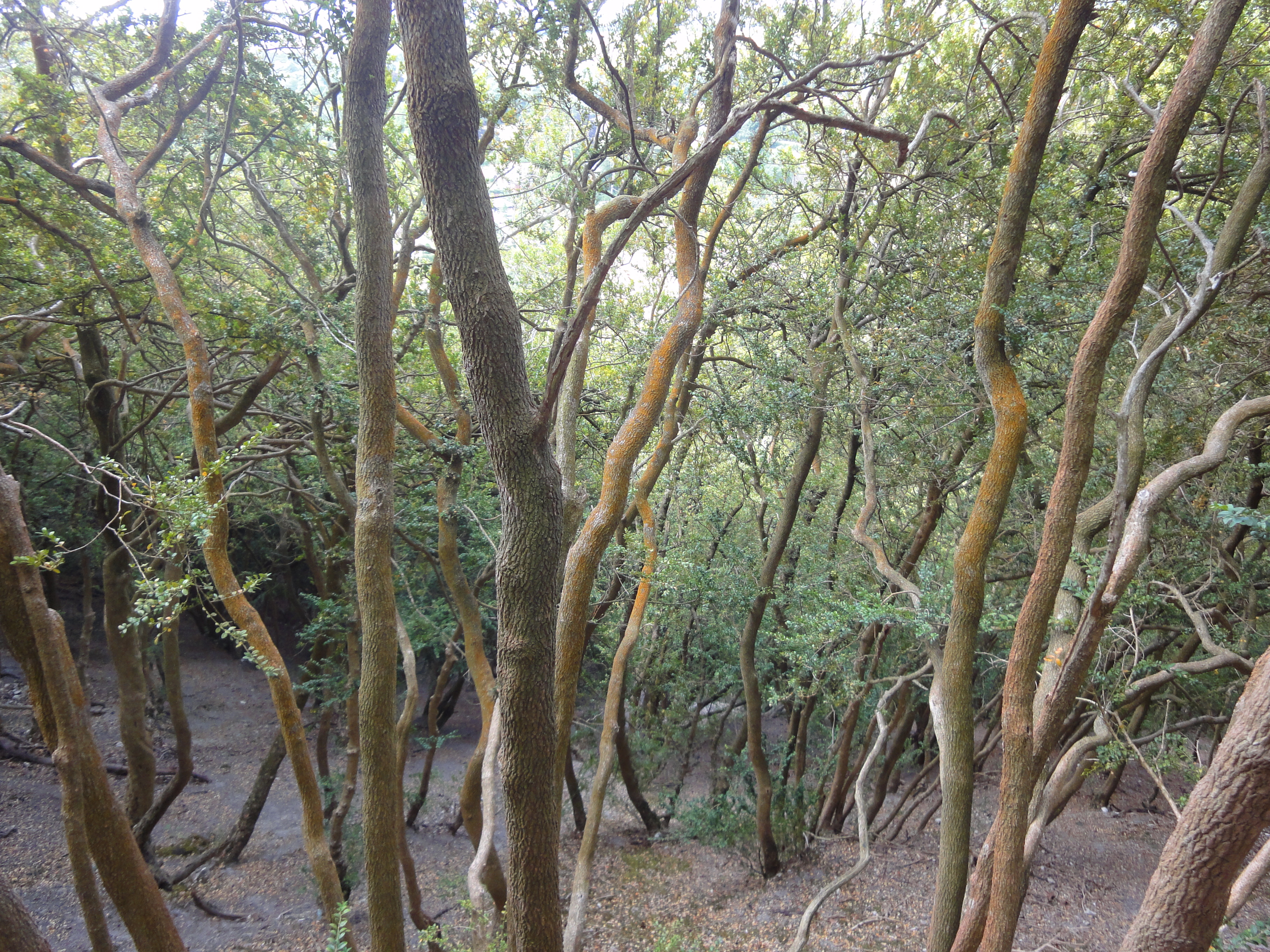 Under the canopy Box trees are bare.  Their trunks are like spindles and even after 200 years growing they are little more than 20 centimetres in diameter. But this is enough to cut down for timber.  Box is the only true hardwood grown in Northern Europe.  This light coloured wood has been used to make small wooden objects that need to be hard,  tough and good looking such as chess pieces, tool handles and wheels for the rigging of wooden sailing ships.